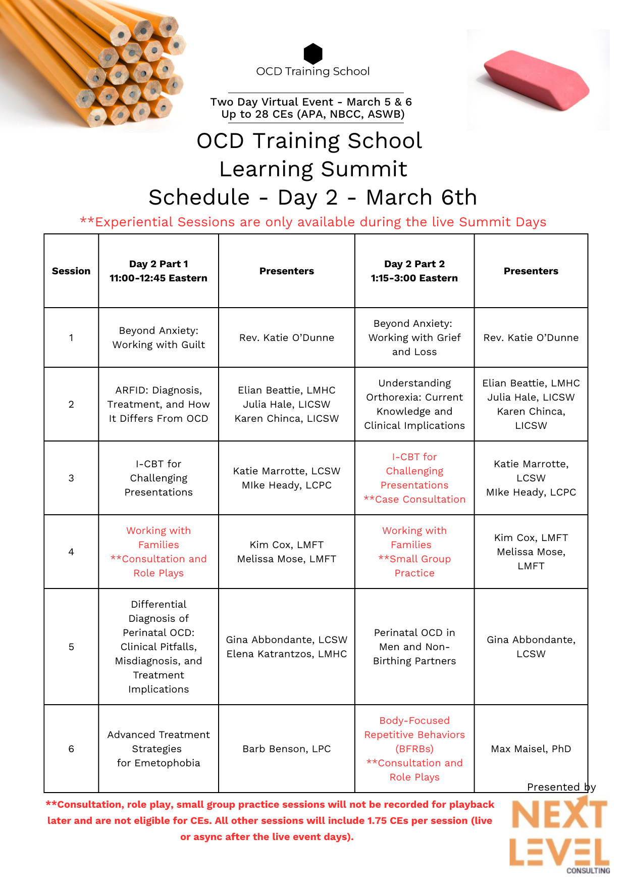Join Kim Cox, LMFT and Melissa Mose, LMFT, as they act out role plays, engage with your case consultation questions, and guide you through small group practice related to skills building. If you are looking for help with how to best support family members and their loved one with OCD - this experiential session (only available live) could be for you! This session is not be recorded for playback is not eligible for CEs.